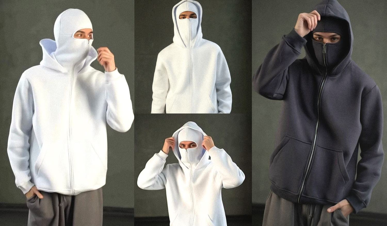 Zobacz naszą bluzę w akcji! 📸 Na zdjęciach z sesji widać każdy detal: od wbudowanej maski po wygodny kaptur. Materiał idealnie układa się na sylwetce, a streetwearowy styl sprawia, że wyróżnisz się w tłumie.