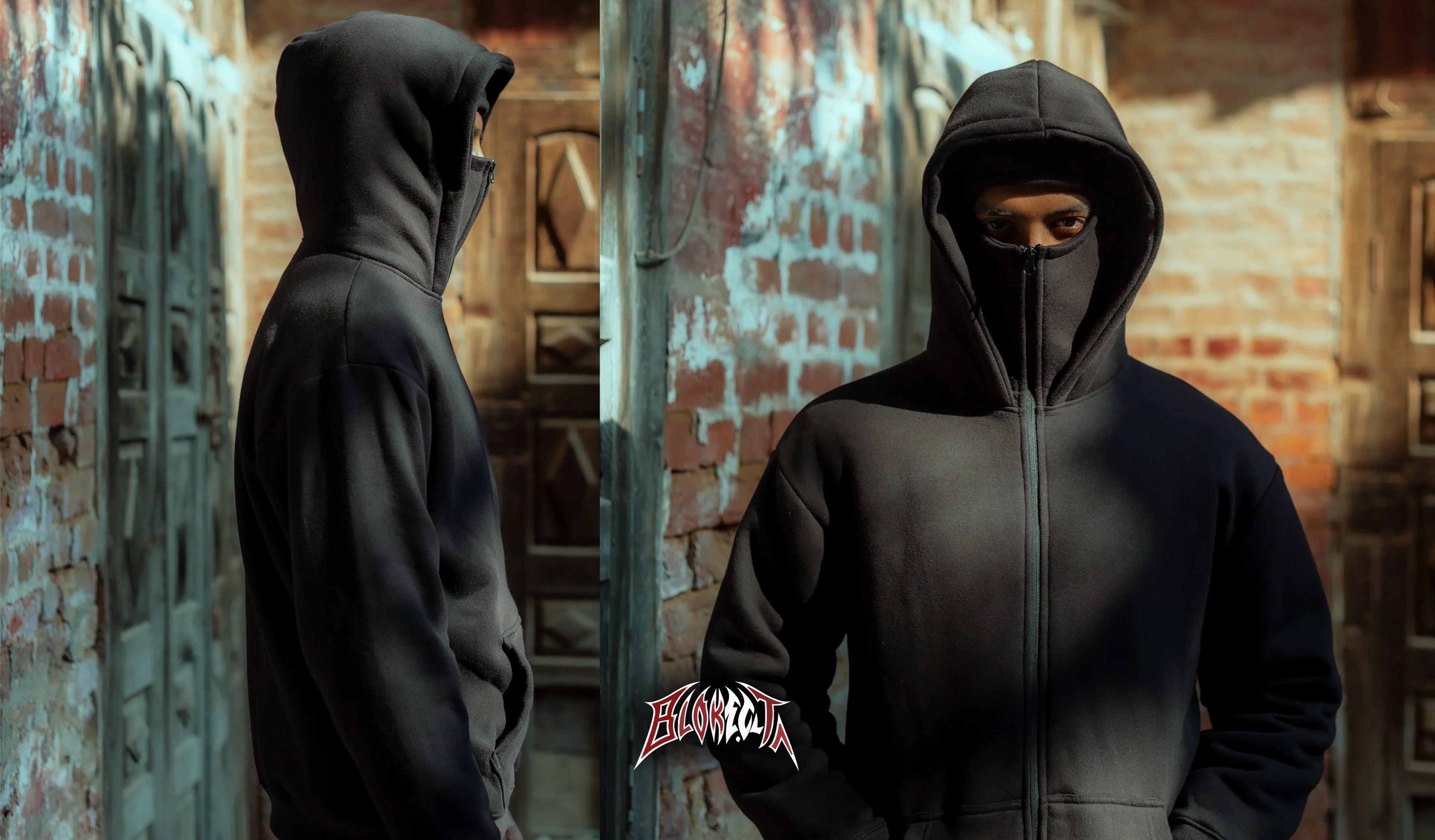 Zobacz naszą bluzę w akcji! 📸 Na zdjęciach z sesji widać każdy detal: od wbudowanej maski po wygodny kaptur. Materiał idealnie układa się na sylwetce, a streetwearowy styl sprawia, że wyróżnisz się w tłumie.